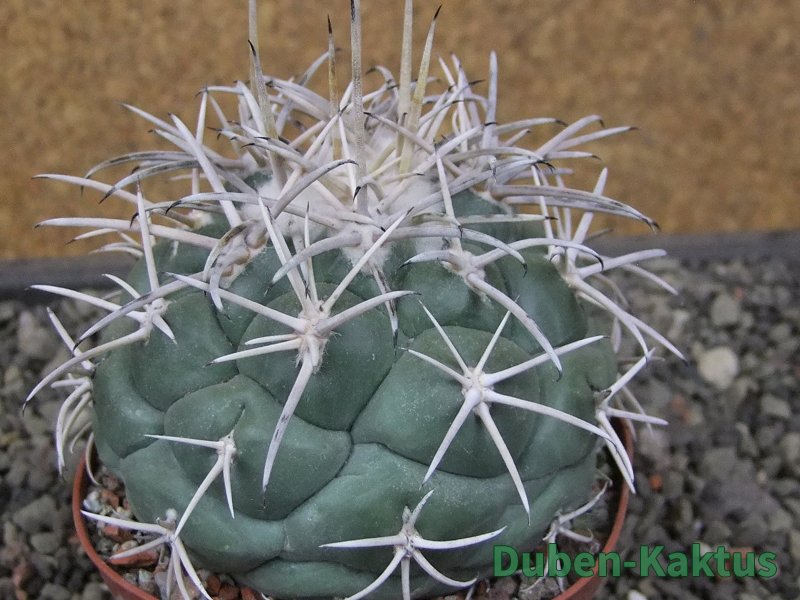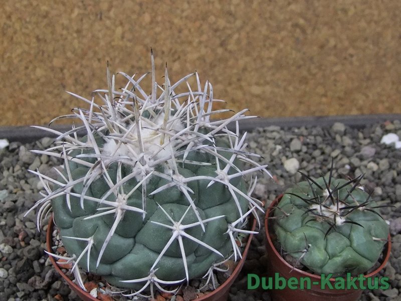 Dospělí kvetoucí semenáč Coryphantha poselgeriana valida El Hundido, podobná s Cero Bola. Na posledních fotografiích je porovnání s kaktusem v květináči 5,5 cm.