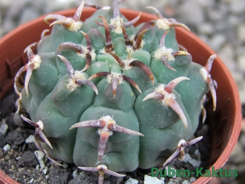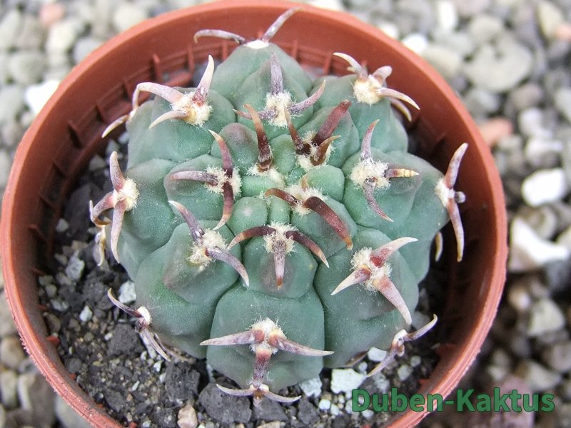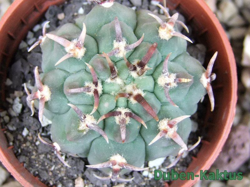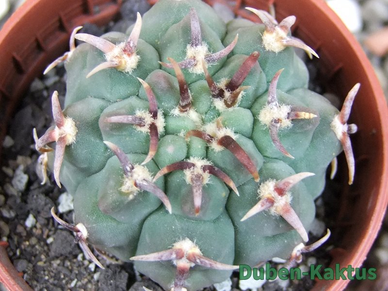 Gymnocalycium watteri unguispinum, postupnou selekcí jsme vyšlechtili Gymnocalycium s krátkými drápkatými trny. Kaktus, který zachovává diskovitý tvar i po 20 letech. Pří výsevu těchto kaktusů je 80% drápkatých rostlin.