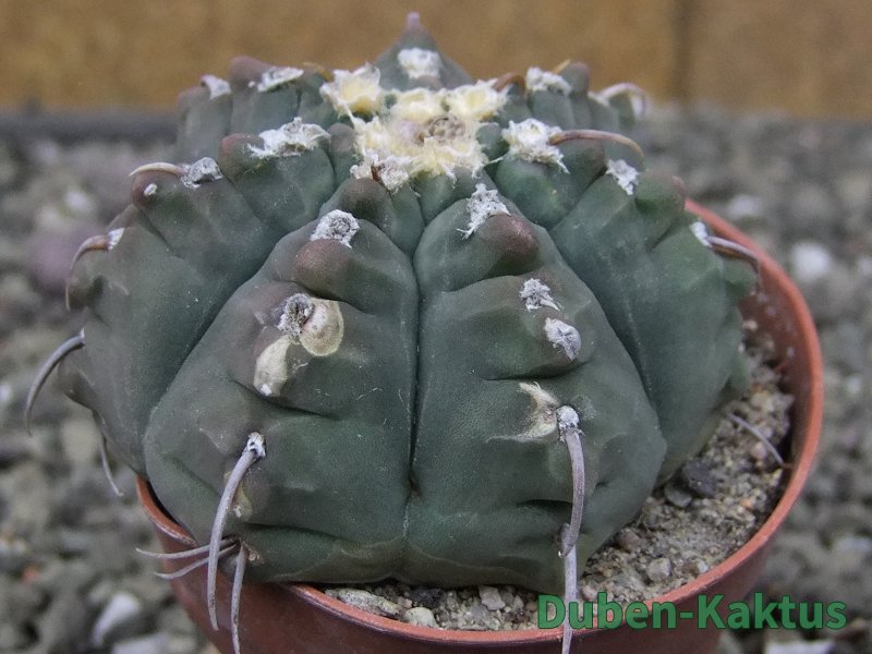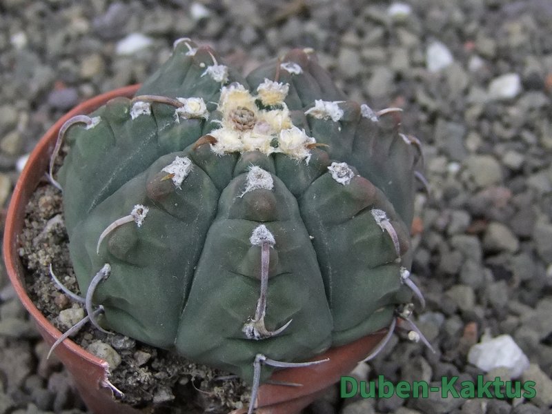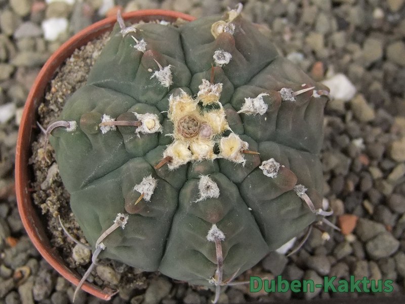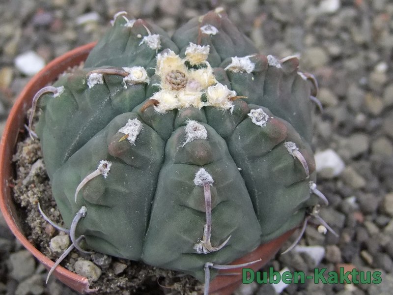 Gymnocalycium watteri unguispinum, postupnou selekcí jsme vyšlechtili Gymnocalycium s krátkými drápkatými trny. Kaktus, který zachovává diskovitý tvar i po 20 letech. Pří výsevu těchto kaktusů je 80% drápkatých rostlin.