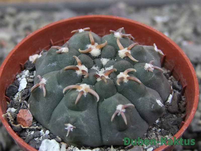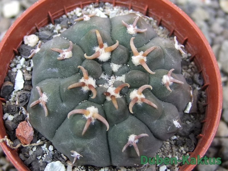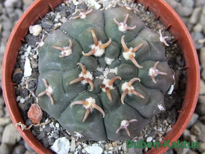 Gymnocalycium watteri unguispinum, postupnou selekcí jsme vyšlechtili Gymnocalycium s krátkými drápkatými trny. Kaktus, který zachovává diskovitý tvar i po 20 letech. Pří výsevu těchto kaktusů je 80% drápkatých rostlin.